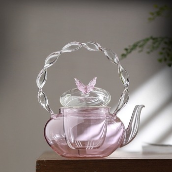 Toptan borosilikat isıya dayanıklı mavi cam çaydanlık demlik pembe kelebek Pot cam demleme çiçek çayı çaydanlık